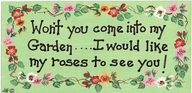 A fun rectangular shape plastic hanging sign with a humourous caption - Won't You Come In To My Garden, I Would Like My Roses To See You. Part of the Smiley Signs range.