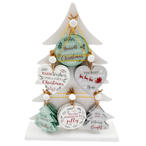 These wooden hanging decorations are the perfect way to add festive sentiment to a Christmas tree with phrases such as 'Have yourself a Merry Little Christmas' and 'Tis the Season to be Jolly'. These pieces would also be perfect small token gifts for adding to a Christmas card or a seasonal hamper of festive goodies. 6 different design variations. Minimum order of 24pcs.