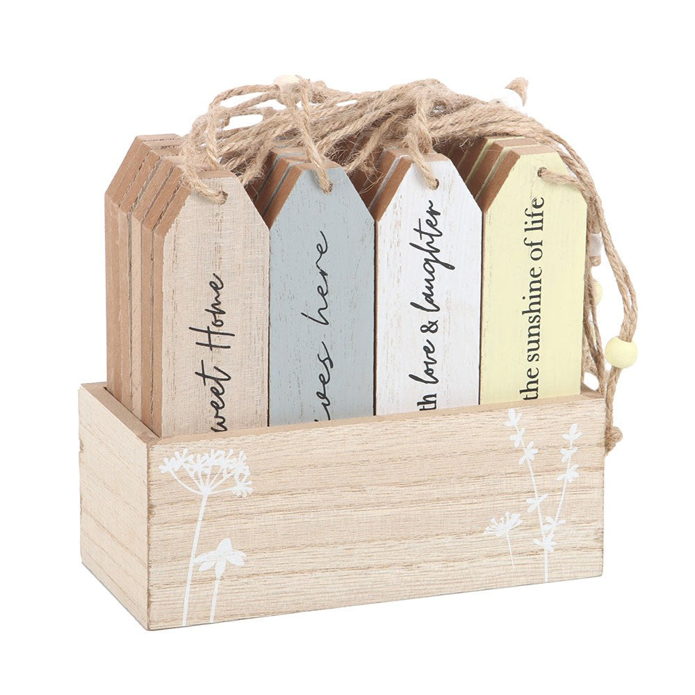 Add a touch of rustic charm to any space with these wooden plaques, beautifully presented in a matching wooden box. Featuring 4 assorted designs - "Friends are the sunshine of life", "Bless this house with love & laughter", "Love lives here", and "Home Sweet Home", each plaque carries a thoughtful and uplifting message, making them perfect for gifting. Priced per piece. Sold as a display of 24 plaques, with 6 of each design.